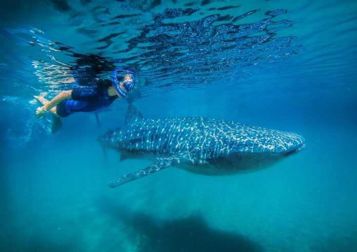 Picture yourself on a small boat, nothing but blue as far as the eye can see. An expansive blue sky above, reflecting the marvelous blue of the water below. That water is clear, teeming with life, and the glow from the sun feels warm on your skin. The excitement is building. You scan the area surrounding you just as a 30-foot whale shark glides by, as big as the boat you’re on. Its wide, flat body, dark color, and patterned spots are breathtaking, jaw-dropping. You’ve seen pictures, but wow. Is this really happening, is this a dream? And just then, your guide says it’s time to dive in. Let the fun begin.