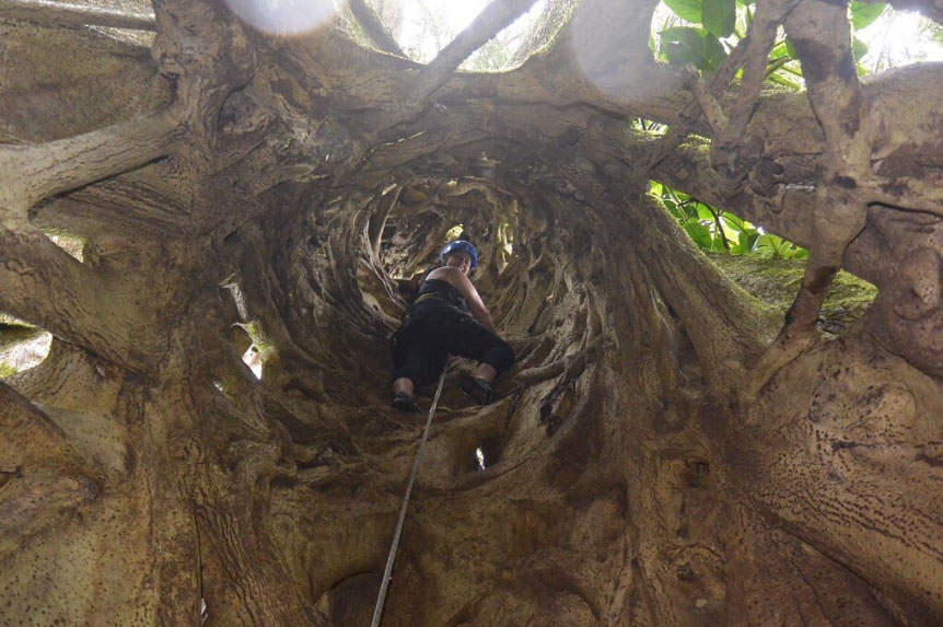 Puede escalar el Ficus hasta el centro hueco de las ramas trenzadas, usar un sistema de varillas de metal para escalar el exterior del árbol o usar una cuerda para subir directamente a la plataforma superior. Al volver a bajar, puede elegir bajar, o dar el salto y bajar en rapel más de 100 pies. Para un regalo especial adicional, visite la Caminata Nocturna en Finca Modelo cuando el árbol está iluminado y puede trepar justo a tiempo para el atardecer.
